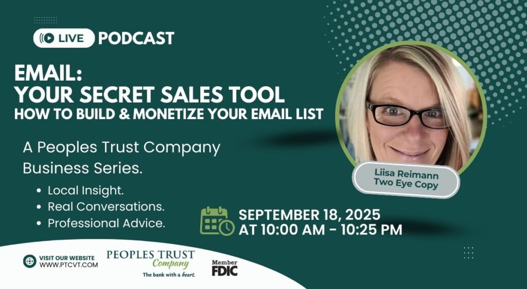 Tune in to the Peoples Trust Company Business Podcast as we sit down with Liisa Reimann, founder of Two Eye Copy, to unlock the power of one of the most effective (and overlooked) business tools: email.Liisa will share insider strategies on how to build, grow, and monetize your email list—turning it into your top-secret sales tool. Whether you’re a small business owner or just starting to think about marketing, this is one episode you won’t want to miss.
